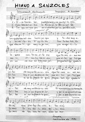 Dedicado todos estos años en cuerpo y alma a la composición y a la recuperación y conservación del cancionero tradicional y popular de Castilla y León, y hoy convertido en todo un referente en el ámbito etnomusicológico, D. Miguel estuvo rememorandome algunos de sus muchos recuerdos de la localidad y de sus gentes que en su día tan bien lo acogieron. Y además, nos ha querido hacer un pequeño regalo en forma de partitura: nuestro himno, "El himno de Sanzoles", ese que tanto exalta nuestra tierra, nuestras fiestas, nuestros valores, nuestras gentes y nuestros corazones (sobre todo en fiestas...je,je) y que cuando lo cantamos todos juntos, nos une en un mismo sentimiento: en ese amor por nuestro pueblo.